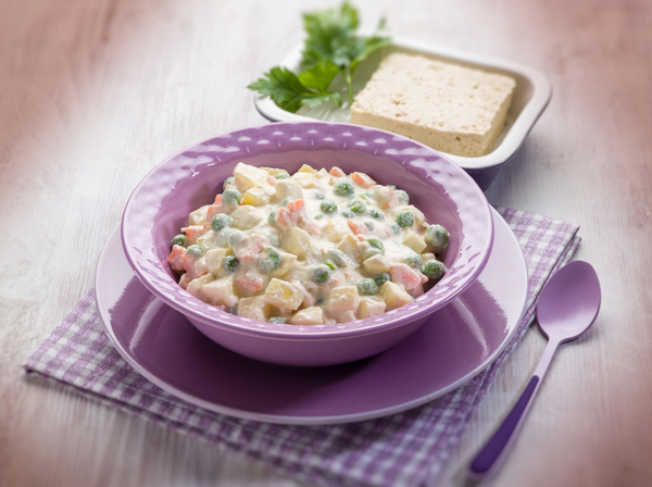 Куриное филе отварить до готовности в подсоленной воде. Картофель промыть и отварить, дать остыть и очистить. Яйца сварить вкрутую, охладить и очистить. Лук очистить.