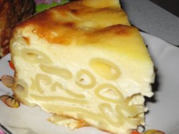 Взбить три белка, смешать с творогом, потом добавить макароны. Форму смазать маслом, выложить творожную массу, разровнять. Верх облить растопленным сливочным маслом.
