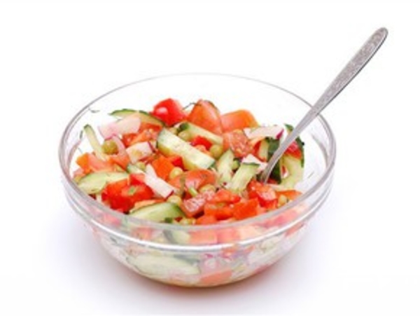 Помидоры, свежий огурец средней величины, небольшую редьку и луковицу тонко нарезать.