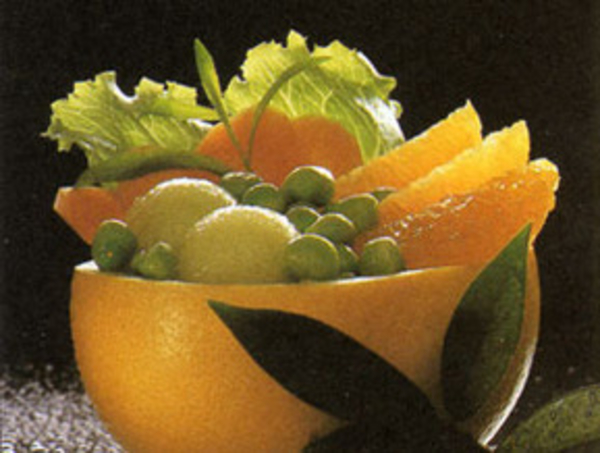 Почистите апельсины и разделите их на дольки. Удалите с долек пленку. Почистите, помойте и порежьте морковь на кусочки. Вымойте горох. Положите нарезанную морковь и горох в кипяченую воду. Вскипятите и варите 3-5 минут. Слейте воду и остудите. Выложите все в салатник или глубокую миску для фруктов.