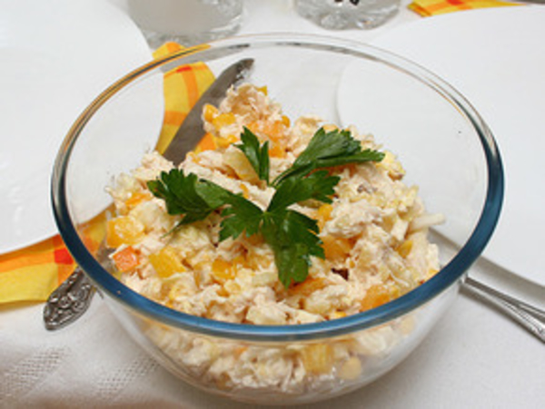 Отварить куриные грудки и мелко порезать. Затем нарезать салат, перец и ананас. Все смешать, добавить кукурузу.