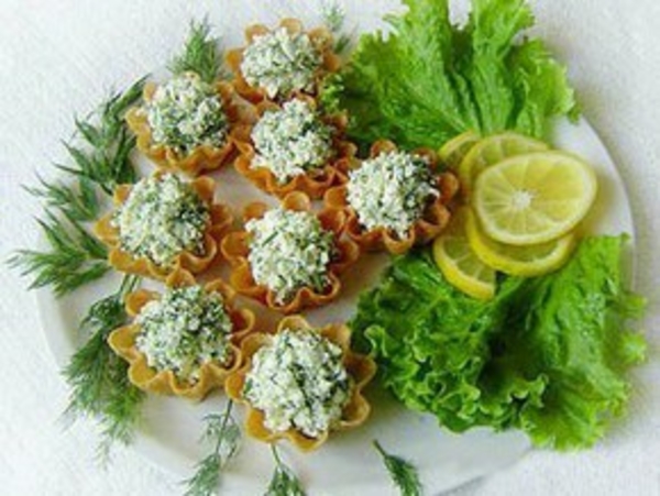 Смешать чеснок и укроп с растёртым творогом. Наполнить полученной смесью тарталетки.
