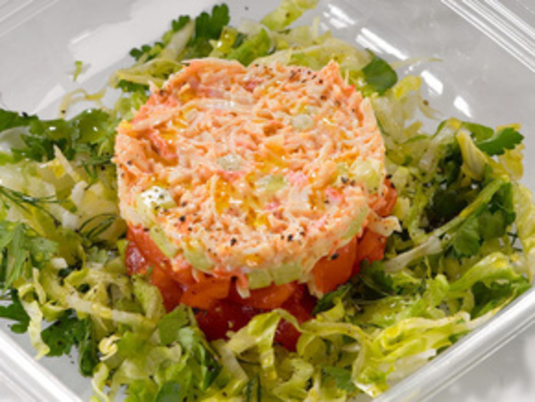 Измельчить ингредиенты, перемешать, добавить майонезный и креветочный соуса.
