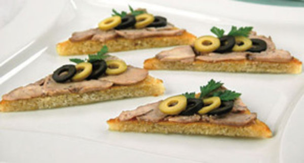 На хлеб уложите печень, затем нарезанные колечками оливки и маслины.