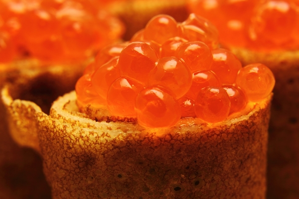 Когда все блины будут испечены, нужно немного подождать чтобы они стали чуть тёплыми. Затем вдоль одного края каждого блина, положить немного икры и закрутить рулетом.