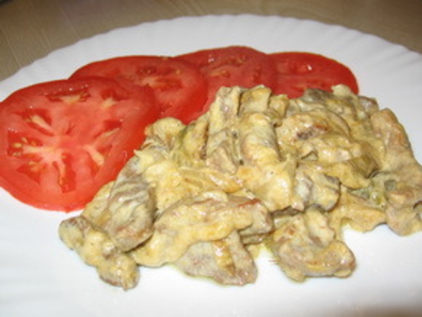 Мясо порезать ломтиками, поперчить, посолить, панировать в муке и обжарить, убрать на тарелку.