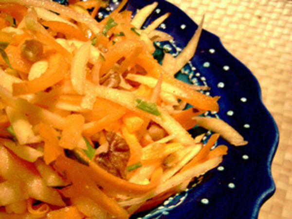 Яблоки и морковь натереть на терке, сбрызнуть лимонным соком, порвать руками и добавить листья салата и все перемешать.