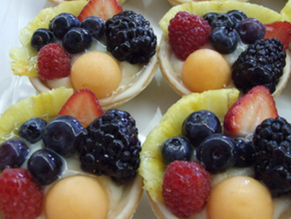 В корзиночки кладут повидло, сверху в виде орнамента размещают свежие или консервированные фрукты или ягоды. Заливают слегка вязким желе и дают ему застыть в холодильнике.