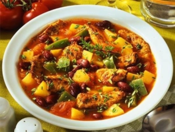 Потушить нарезанное ломтиками мясо в горячем масле, залить кипятком и добавить пряности. Затем варить мясо почти до готовности. Добавить нарезанные помидоры и картофель и варить еще 10 минут, а затем положить отваренные горошек и фасоль (можно стручковую).