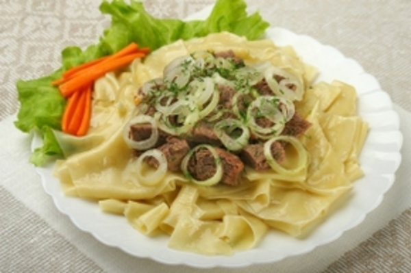 Лепешки сваренные в течении 5-10 мин. (в зависимости от толщины), достаем дуршлаком, выкладываем в большое плоское блюдо, затем мясо и лук с картошкой. Украшаем зеленью.