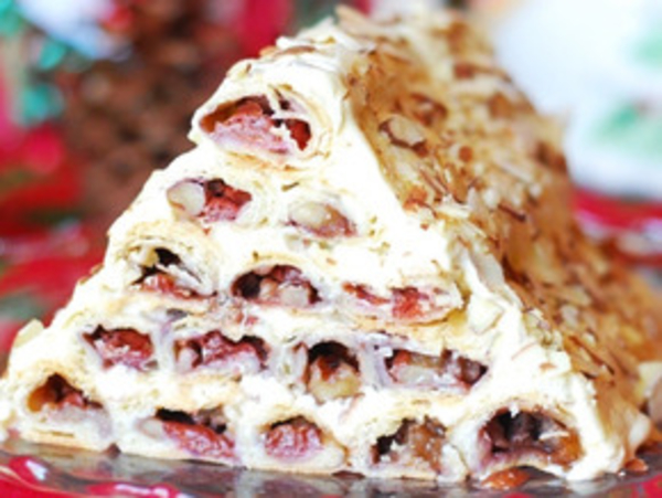 Приготовить крем: сметану взбить с сахаром до образования густой пены. На плоское блюдо выложить 5 "бревнышек". Полить "бревнышки" кремом и уложить сверху 4 "бревнышка". Снова полить кремом и положить 3 "бревнышка". Крем и 2 "бревнышка". Крем и 1 "бревнышко".