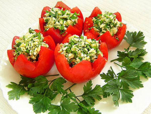 Каждый помидор разрезать на две равные части. В отдельной посуде смешать мелко нарезанные чеснок и укроп, размятую брынзу, майонез.
