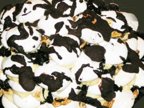 На блюдо для торта выложить слой безе. Остальные безе намазать кремом и выложить на блюдо в виде горки. Намазывать кремом нужно только одну сторону безе.