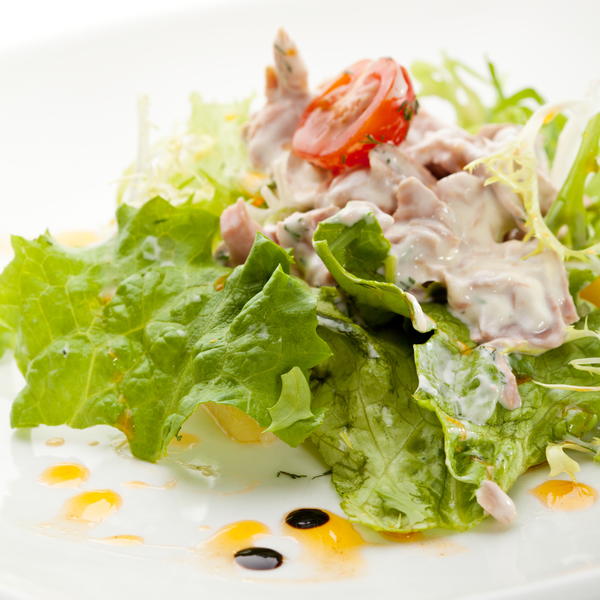 Зелень сельдерея вымыть и нарезать не очень крупно. Взбить сметану, соль и имбирь. Добавить филе тунца, сельдерей и яблоки. Хорошо перемешать.