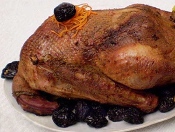 Уложите на блюдо для жарки, политое 3 столовыми ложками оливкового масла, жарьте при температуре около 220 С полтора часа, поливая его получившимся соком.