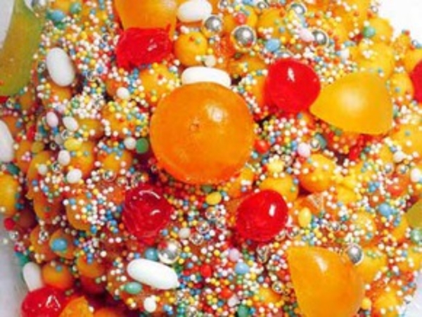 Разложить струффоли на блюде ввиде горки и украсить кусочками цукатов и сахарными шариками.