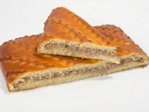 Тесто разделить на две части. Часть выложить на противень, застеленный промасленным пергаментом. На тесто выложить мясо с луком и накрыть оставшимся тестом, защипнуть края.