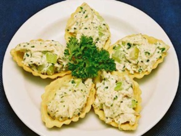 Нарезать курицу и огурцы кубиками, измельчить яйца, заправить майонезом, добавить зелень, перешать и наполнить салатом корзиночки.