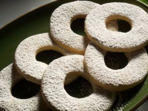 Насыпать на рабочую поверхность ваниль, миндаль, муку, сахар и соль. Сверху положить хлопья сливочного масла. С помощью лопаточки все порубить в крошку. Добавить желтки и вымесить в однородное тесто. Выпекать при температуре 190° С в течение 12 мин. Смешать сахар с ванилью и обвалять в смеси печенье.