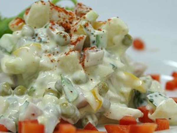 Ветчину, вареное мясо, вареный картофель, яблоки, соленые огурцы, очищенные от кожицы и семян, шинкуют соломкой, заправляют майонезом, укладывают в салатник, украшают яйцом, зеленым горошком, огурцом и зеленью петрушки.