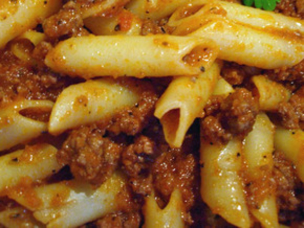 В глубокой сковороде распустить сливочное масло, добавить макароны, мясной фарш и совместно прогреть, добавив по вкусу соль и перец.