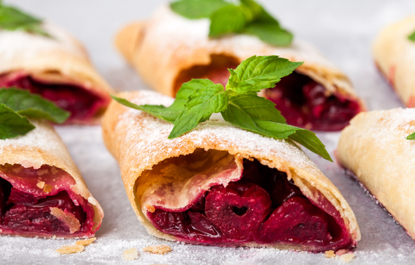 Тесто разделить на 2, 3 или 4 части, в зависимости от типа начинки и желаемого размера струделя. Каждую часть теста раскатать на посыпанном мукой столе как можно тоньше (дырок быть не должно!). Раскатанный пласт накрутить на скалку и аккуратно перенести на застеленный промасленным пергаментом противень.