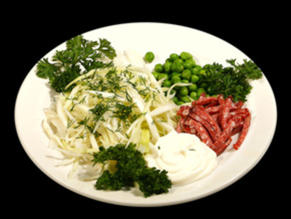 Слить жидкость с горошка. Порезать капусту и колбасу соломкой.