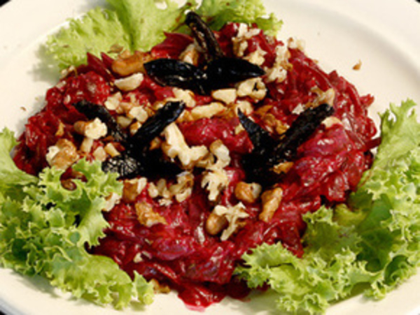 Чернослив, свеклу и измельченные грецкие орехи смешать и заправить майонезом.