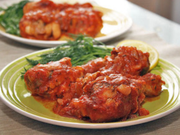 Кастрюлю накрыть крышкой, птицу тушить 1.5 часа на маленьком огне. В конце тушения к мясу добавить нарезанные ошпаренные и очищенные от шкурки помидоры и нарезанную зелень.