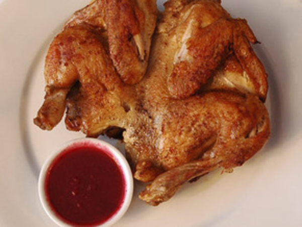 Подготовить тушку, разрезать ее вдоль пополам, посолить, натереть чесноком, смазать сметаной, положить на сковороду с растопленным маслом под пресс и жарить до появления румяной корочки.