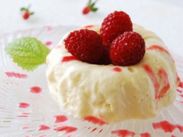Застывший баварский крем выложить на тарелку, полить малиновым сиропом и украсить ягодами малины.
