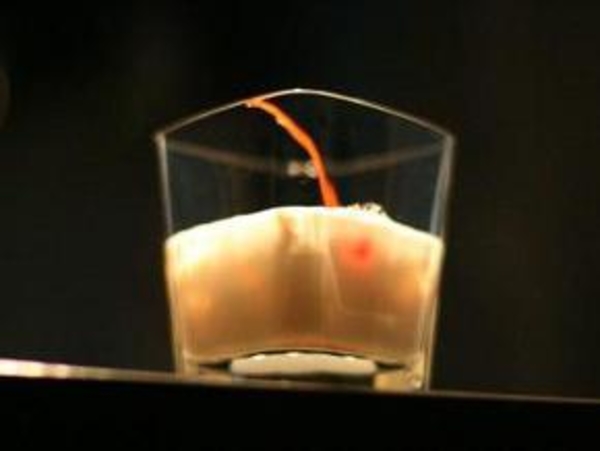 Встряхнуть сливки с Амаретто и дробленым льдом, перелить в коктейльный бокал и подавать.