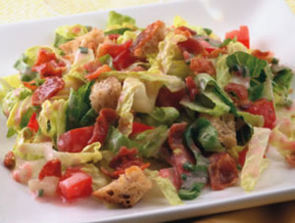 Снять бекон с палочки с помощью вилки. Добавить в салат с крутонами. Побрызгать заправкой с майонезом и посыпать тертым сыром.