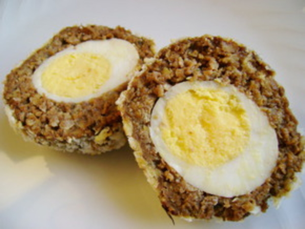 В глубокую сковороду налить масло на 1/3 глубины. Нагреть до температуры 160 гр С. Обжаривать яйца по 2 за раз, в течение 4-5 минут, поворачивая, до золотистой корочки. Достать и обсушить на бумажных кухонных полотенцах. Охладить. Подавать с зеленым салатом и горчицей. Можно подавать и горячими.