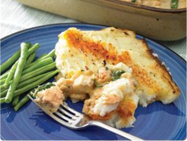 Слейте картошку. Затем поставьте кастрюлю обратно на маленький огонь и разомните в пюре, добавляя масло, оставшиеся сливки, желток и соль. Когда пюре готово, выложите его ложкой на рыбу и примните сверху вилкой. Запекайте в течение 30-35 мин до золотистого цвета.