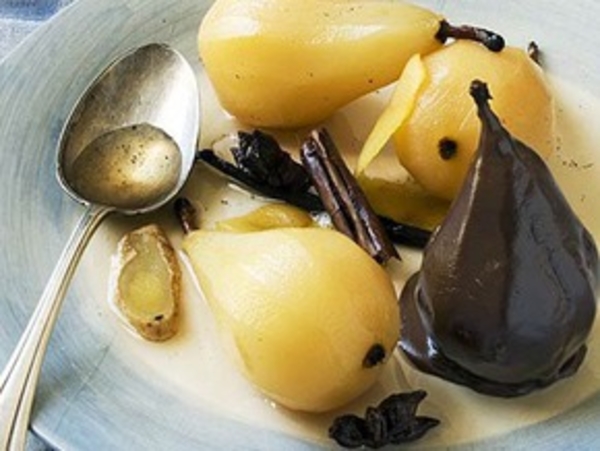 Очистите от кожуры 4 груши, полейте сахарным сиропом и держите на медленном огне 25-30 минут пока груши не станут нежными. Снимите с огня и дайте остыть.
