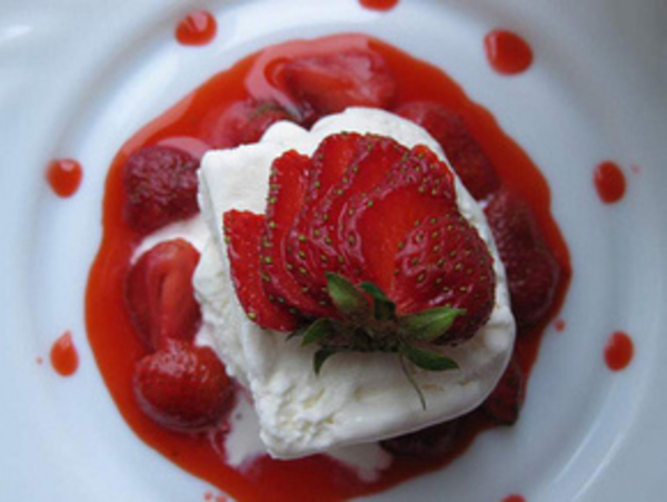 Перед тем как подать на стол, смешайте сметану или сливки с мороженым, взбейте до образования пены и выложите на ягоды.