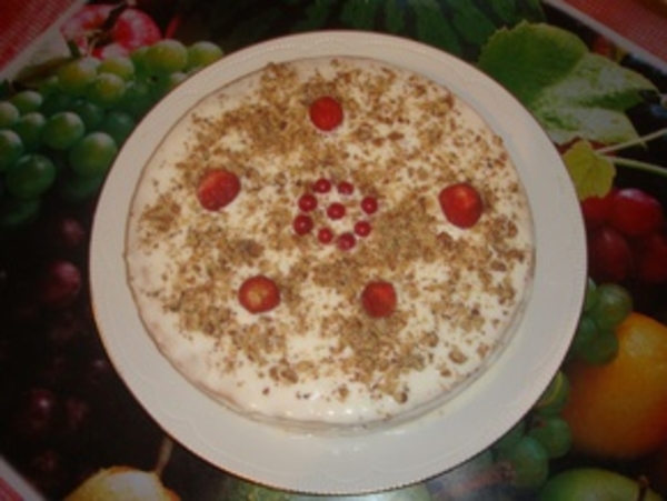 Перемазать охлажденные коржи кремом, а тертыми ядрами грецкого ореха посыпать торт сверху и по бокам.