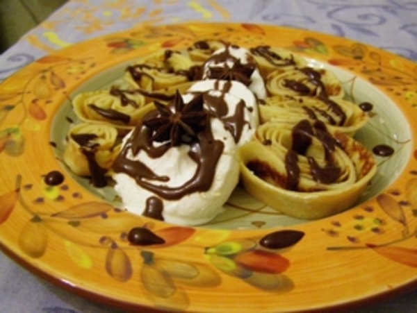 Готовые блины необходимо смазать сливочным маслом, сложить вдвое и скатать трубочкой, потом порезать колечками и выложить на тарелку вокруг мороженого.