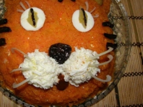 Слой майонеза. Тертой морковью обкладываем всю голову. Из белка яйца нарезаем кружочки для глаз.