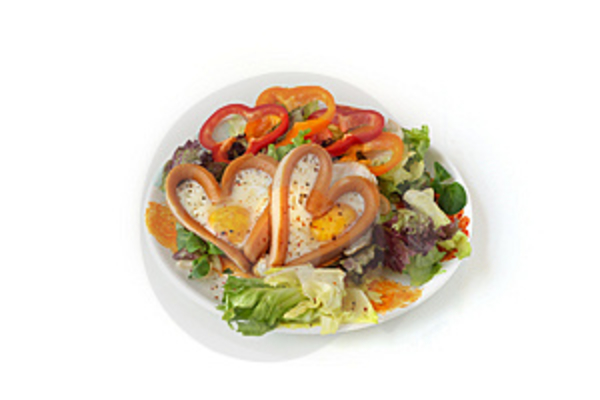 Сосиску разрезаем пополам, не дорезая до конца с одного края около 1 см. Берем разрезанные концы и соединяем их вместе деревянной зубочисткой так, чтобы получилось сердце.