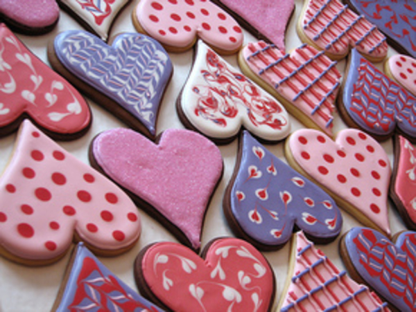 С помощью тюбика с глазурью нарисовать на сердечках рисунок. Оставить на 20 минут, чтобы все застыло.