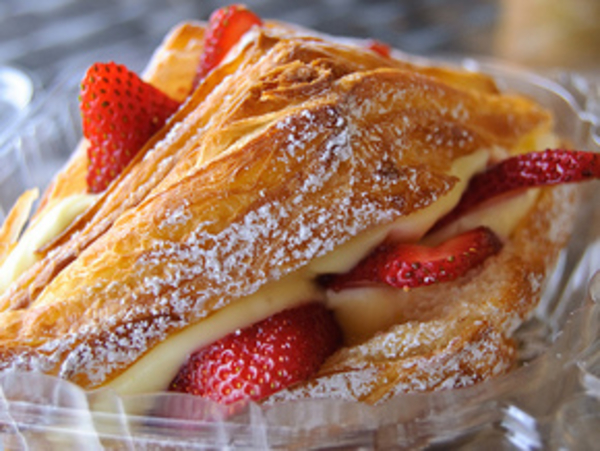 Разогреть готовые круассаны без начинки, разрезать пополам, намазать заварным кремом и разложить кусочки свежей клубники.