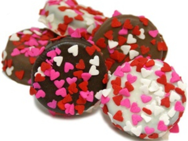 Шоколад растопить (каждый вид шоколада отдельно), полить печенье, затем украсить маленькими конфетками-сердечками.