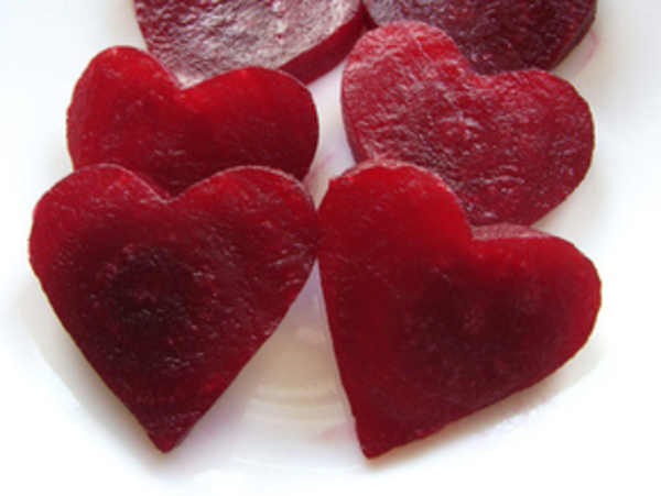 Очистите свеклу, когда она остынет. Порежьте свеклу тонкими ломтиками, а затем вырежьте формочкой или ножом сердечки.