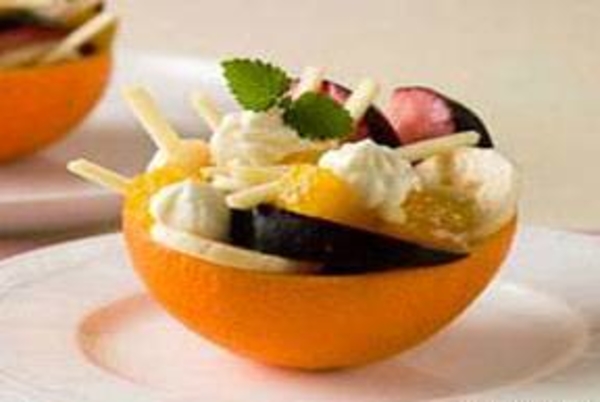 Посыпать приготовленный фруктовый салат 2 столовыми ложками сахарной пудры, а затем полить его лимонным соком и осторожно перемешать. Оставшиеся без мякоти половинки апельсинов наполнить приготовленным фруктовым салатом и поставить в холодильник.