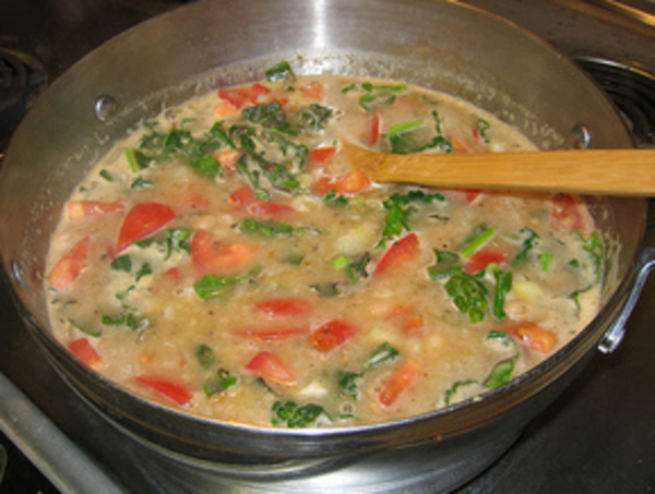 Нашинкуйте лук, мелко порежьте стебли сельдерея. Разогрейте в керамической кастрюле немного оливкового масла, потушите лук и сельдерей.
