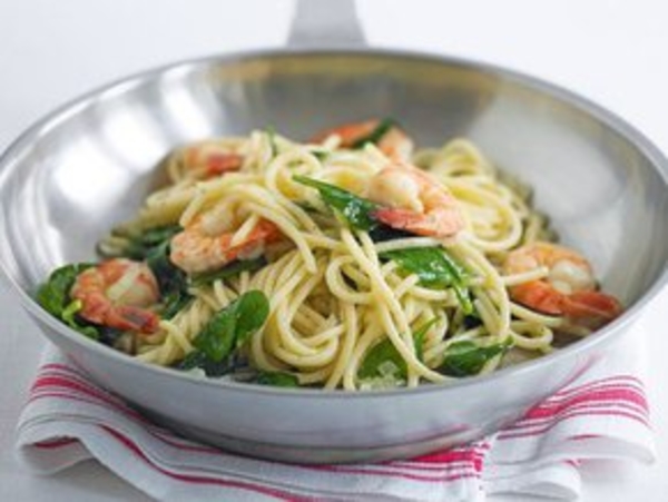 Затем налейте белое вино и подождите, пока оно выпарится. Теперь положите в кастрюлю креветки и влейте лимонный сок. Держите на огне около 10 минут. Добавьте соль и перец.