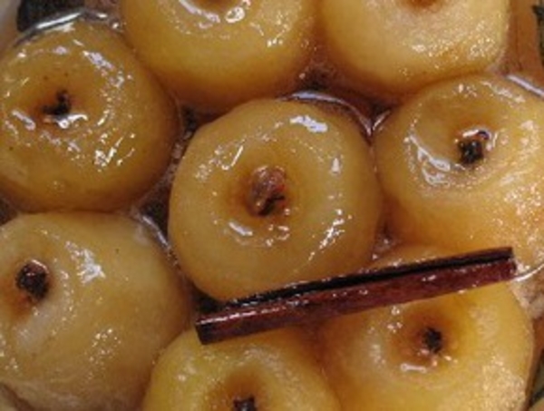 При подаче в креманку укладывают яблоко и заливают сиропом, в который предварительно добавляют вино и корицу.