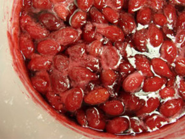 Кизил перебрать, промыть. В кастрюле подходящего размера вскипятить воду. В сито положить кизил - небольшое количество - и бланшировать одну минуту.